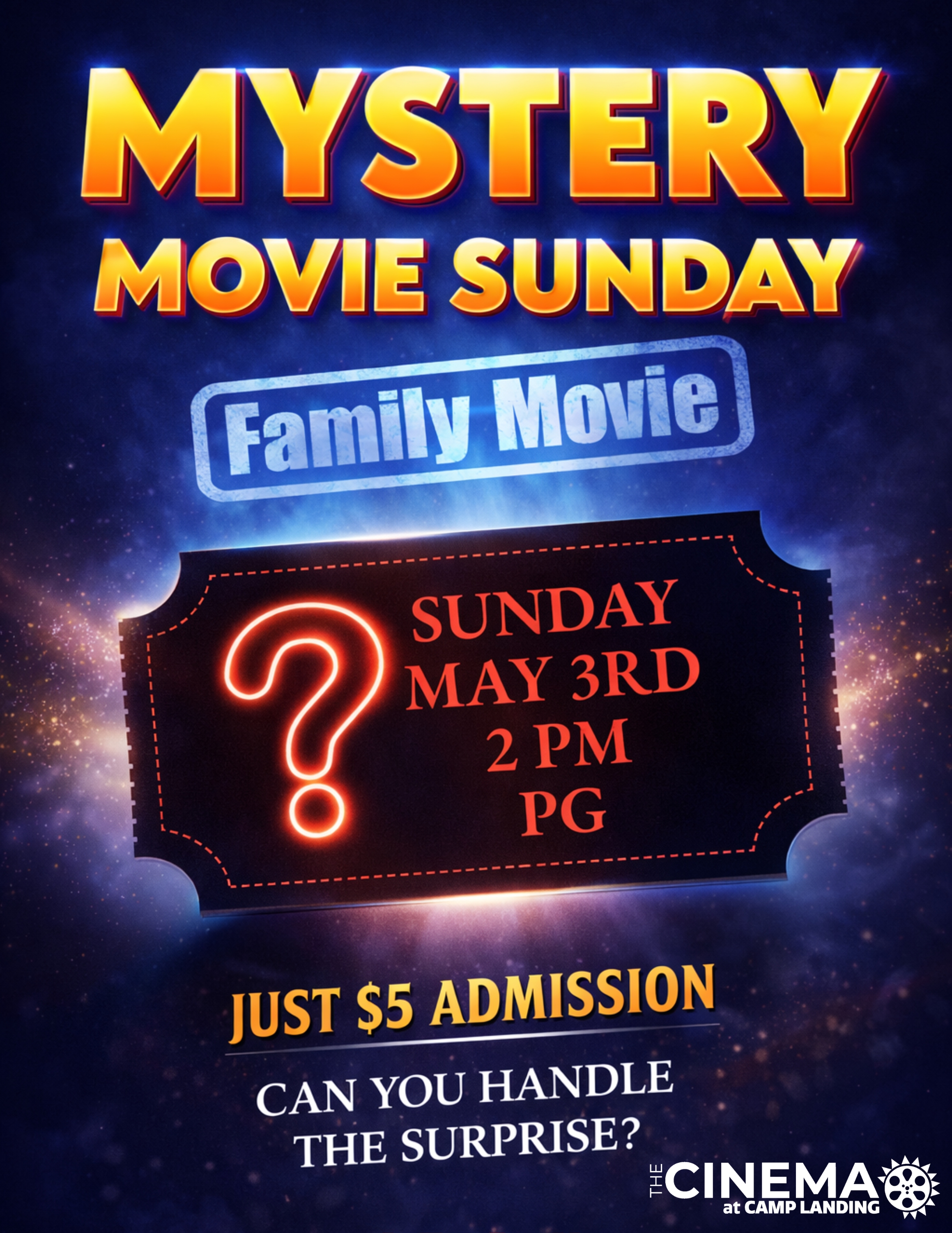 Get your tickets now at CinemaCampLanding.com or LegacyTheaters.comComedyPT1H50MPG2026-05-03Mystery Movie Sunday FAMILY 5/03"Mystery Movie Sunday FAMILY 5/03"Showtimes